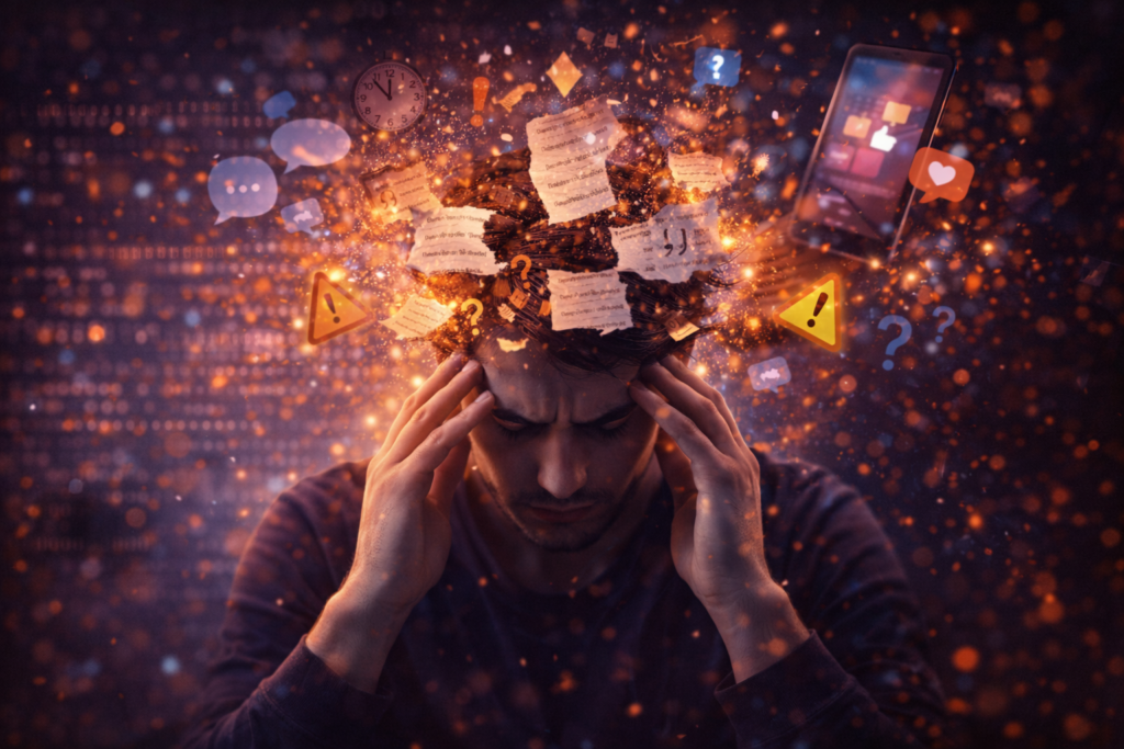O excesso de estímulos não afeta apenas a mente. O corpo entra em estado constante de alerta. O sistema nervoso passa a operar como se houvesse sempre algo urgente a resolver.